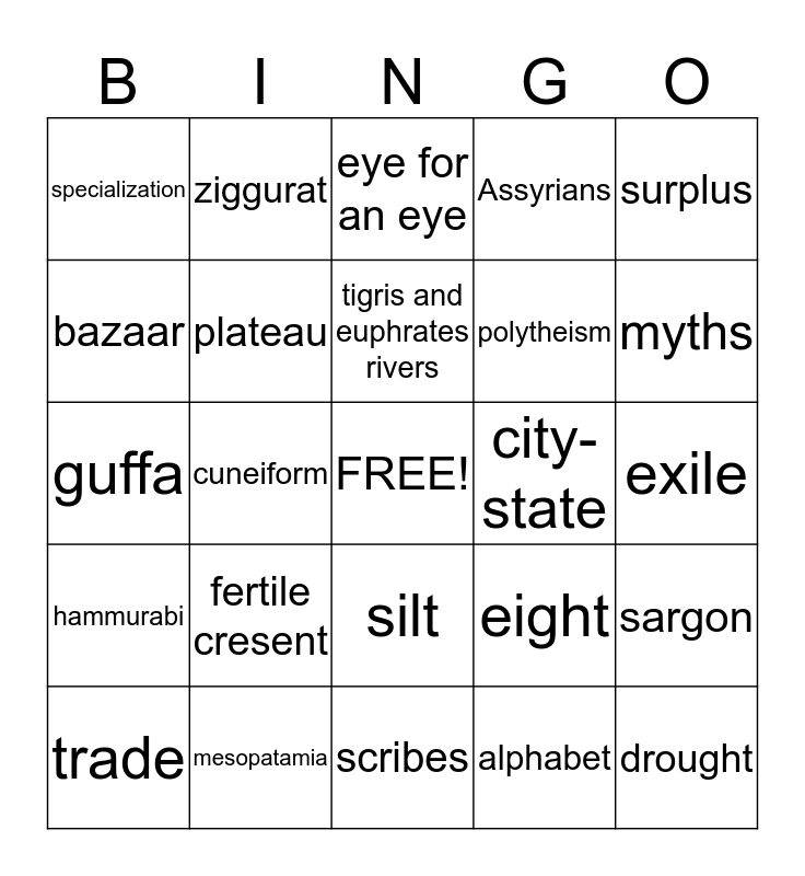 This bingo card has a free space and 24 words: fertile cresent, mesopatamia, tigris and euphrates rivers, trade, surplus, specialization, bazaar, ziggurat, city-state, silt, polytheism, guffa, eight, sargon, plateau, alphabet, exile, eye for an eye, myths, cuneiform, drought, hammurabi, Assyrians and scribes.