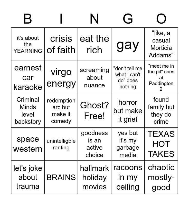This bingo card has a free space and 24 words: unintelligble ranting, BRAINS, screaming about nuance, let's joke about trauma, "like, a casual Morticia Addams", it's about the YEARNING, earnest car karaoke, crisis of faith, horror but make it grief, goodness is an active choice, "don't tell me what i can't do" does nothing, Criminal Minds level backstory, yes but it's my garbage media, TEXAS HOT TAKES, virgo energy, racoons in my ceiling, found family but they do crime, eat the rich, "meet me in the pit" cries at Paddington 2, redemption arc but make it comedy, chaotic mostly-good, space western, gay and hallmark holiday movies.