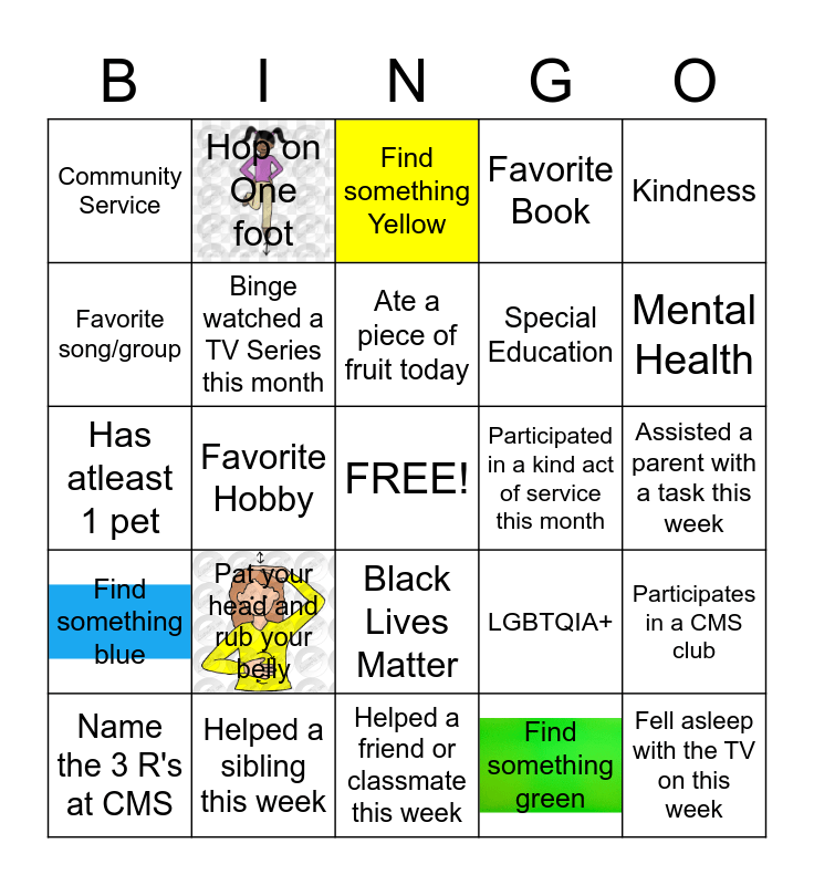 This bingo card has 5 images, a free space and 24 words: Pat your head and rub your belly, Helped a sibling this week, Ate a piece of fruit today, Name the 3 R's at CMS, Kindness, Community Service, Favorite song/group, Hop on One foot, Participated in a kind act of service this month, Black Lives Matter, Special Education, Has atleast 1 pet, LGBTQIA+, Participates in a CMS club, Binge watched a TV Series this month, Find something green, Assisted a parent with a task this week, Find something Yellow, Mental Health, Favorite Hobby, Fell asleep with the TV on this week, Find something blue, Favorite Book and Helped a friend or classmate this week.