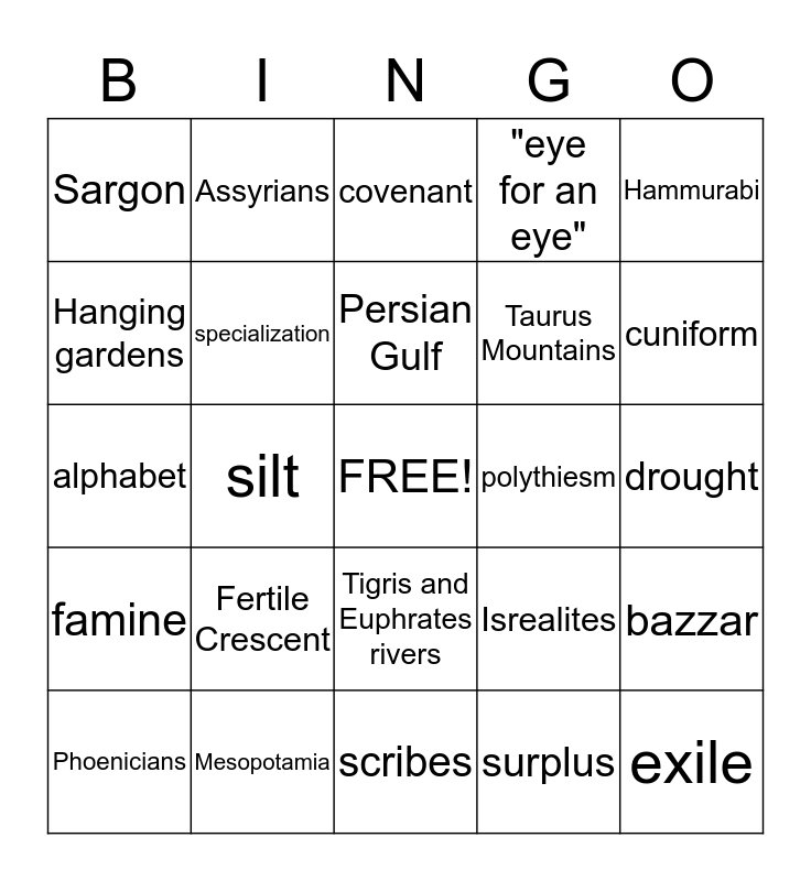This bingo card has a free space and 24 words: Fertile Crescent, Mesopotamia, Persian Gulf, Phoenicians, Hammurabi, Sargon, Hanging gardens, Assyrians, polythiesm, Tigris and Euphrates rivers, Taurus Mountains, alphabet, Isrealites, bazzar, specialization, surplus, drought, covenant, cuniform, silt, exile, famine, "eye for an eye" and scribes.