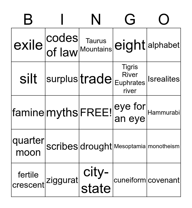 This bingo card has a free space and 24 words: scribes, ziggurat, trade, fertile crescent, alphabet, exile, silt, codes of law, eye for an eye, drought, Tigris River Euphrates river, famine, Mesoptamia, monotheism, surplus, cuneiform, Hammurabi, Taurus Mountains, Isrealites, myths, covenant, quarter moon, eight and city-state.