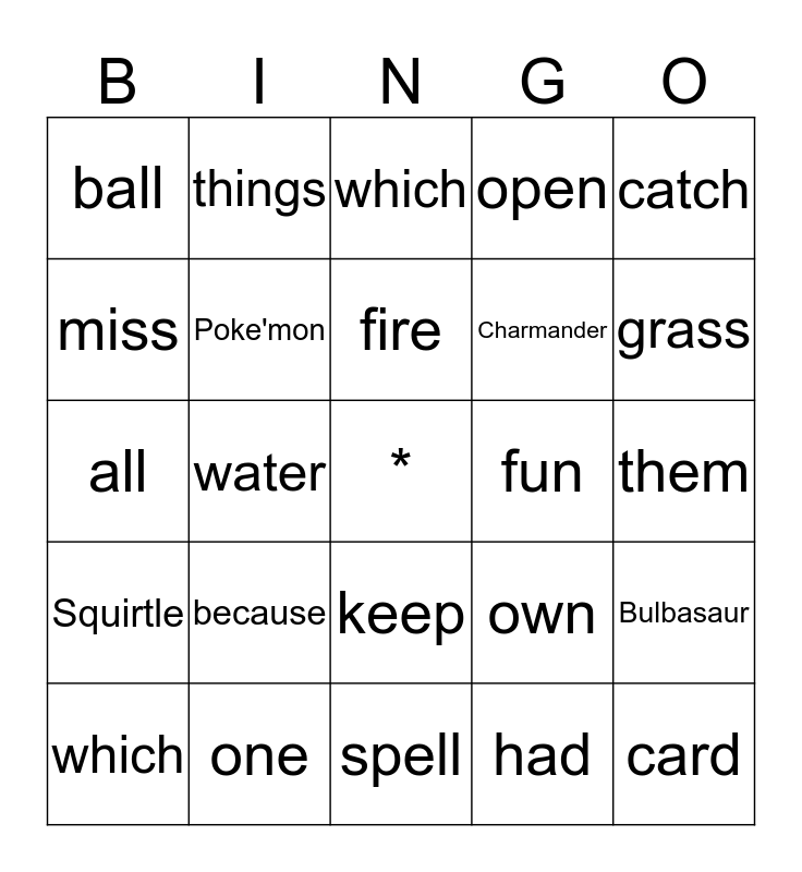 This bingo card has a free space and 24 words: because, one, fire, which, catch, ball, miss, things, fun, keep, Charmander, all, own, Bulbasaur, Poke'mon, had, them, which, grass, water, card, Squirtle, open and spell.