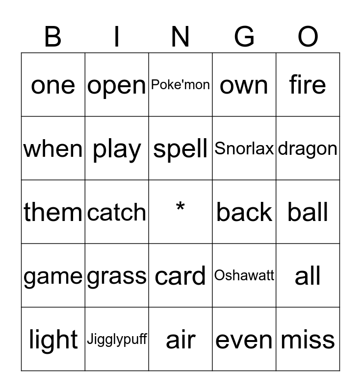 This bingo card has a free space and 24 words: grass, Jigglypuff, spell, light, fire, one, when, open, back, card, Snorlax, them, Oshawatt, all, play, even, ball, Poke'mon, dragon, catch, miss, game, own and air.