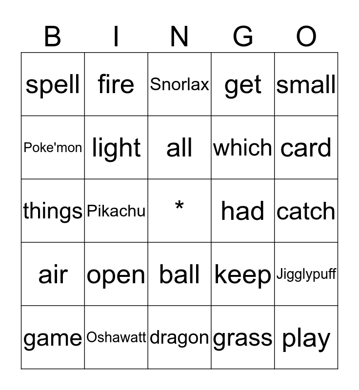 This bingo card has a free space and 24 words: open, Oshawatt, all, game, small, spell, Poke'mon, fire, had, ball, which, things, keep, Jigglypuff, light, grass, catch, Snorlax, card, Pikachu, play, air, get and dragon.
