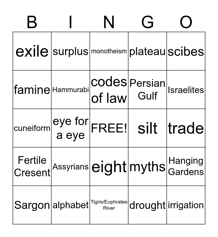 This bingo card has a free space and 24 words: Assyrians, alphabet, codes of law, Sargon, scibes, exile, famine, surplus, silt, eight, Persian Gulf, cuneiform, myths, Hanging Gardens, Hammurabi, drought, trade, monotheism, Israelites, eye for a eye, irrigation, Fertile Cresent, plateau and Tigris/Euphrates River.