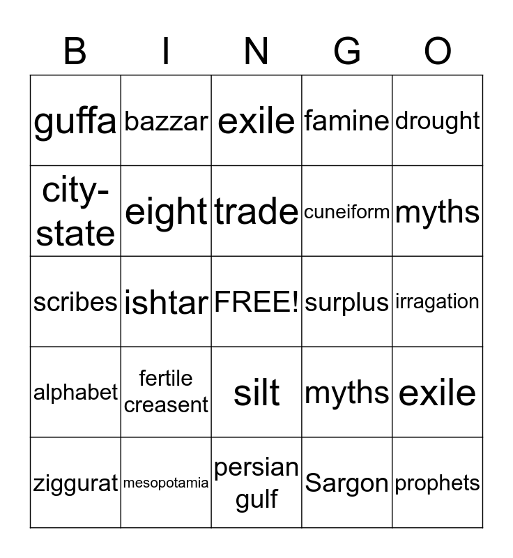 This bingo card has a free space and 24 words: fertile creasent, mesopotamia, trade, ziggurat, drought, guffa, city-state, bazzar, surplus, silt, cuneiform, scribes, myths, exile, eight, Sargon, irragation, exile, myths, ishtar, prophets, alphabet, famine and persian gulf.
