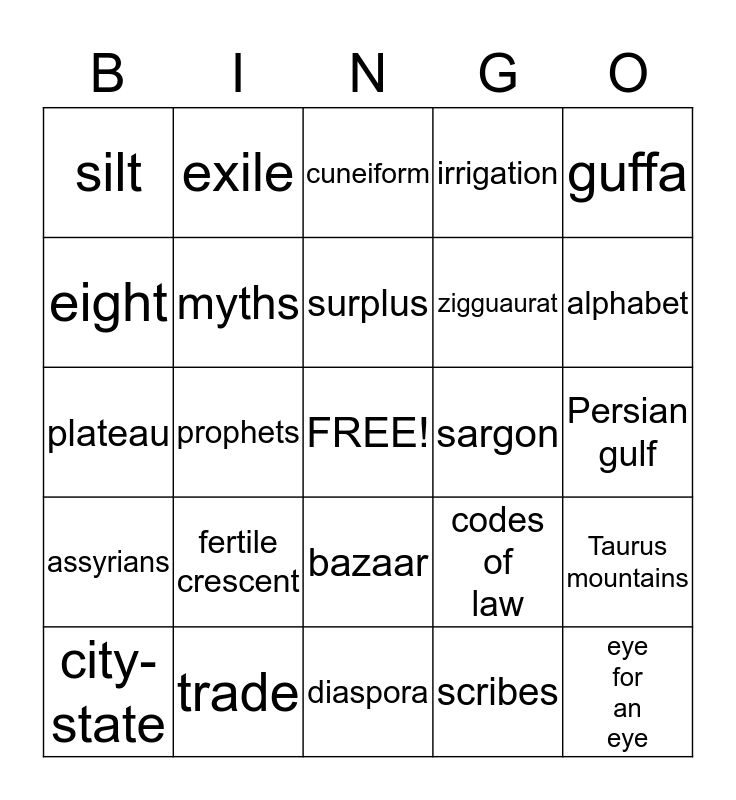 This bingo card has a free space and 24 words: fertile crescent, trade, surplus, city-state, guffa, silt, eight, exile, sargon, bazaar, zigguaurat, plateau, codes of law, Taurus mountains, myths, scribes, Persian gulf, cuneiform, alphabet, prophets, eye for an eye, assyrians, irrigation and diaspora.