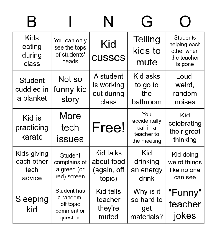 This bingo card has a free space and 24 words: Student complains of a green (or red) screen, Student has a random, off topic comment or question, A student is working out during class, Sleeping kid, Students helping each other when the teacher is gone, Kids eating during class, Student cuddled in a blanket, You can only see the tops of students' heads, You accidentally call in a teacher to the meeting, Kid talks about food (again, off topic), Kid asks to go to the bathroom, Kid is practicing karate, Kid drinking an energy drink, Kid doing weird things like no one can see, Not so funny kid story, Why is it so hard to get materials?, Kid celebrating their great thinking, Kid cusses, Loud, weird, random noises, More tech issues, "Funny" teacher jokes, Kids giving each other tech advice, Telling kids to mute and Kid tells teacher they're muted.