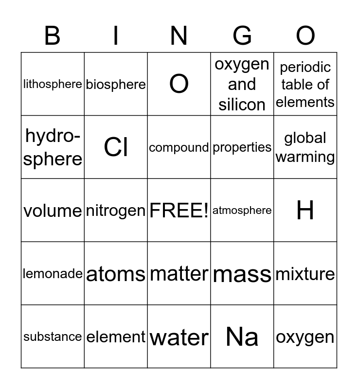 This bingo card has a free space and 24 words: atoms, element, compound, substance, periodic table of elements, lithosphere, hydro-sphere, biosphere, atmosphere, matter, properties, volume, mass, mixture, Cl, Na, H, O, global warming, nitrogen, oxygen, lemonade, oxygen and silicon and water.
