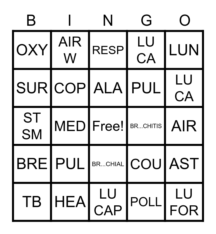 This bingo card has a free space and 24 words: PUL, HEA, ALA, TB, LUN, OXY, SUR, AIR W, BR...CHITIS, BR...CHIAL, PUL, ST SM, COU, AST, COP, POLL, AIR, RESP, LU CA, MED, LU FOR, BRE, LU CA and LU CAP.