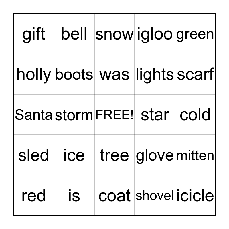 This bingo card has a free space and 24 words: ice, is, was, red, green, gift, holly, bell, star, tree, lights, Santa, glove, mitten, boots, shovel, cold, snow, scarf, storm, icicle, sled, igloo and coat.