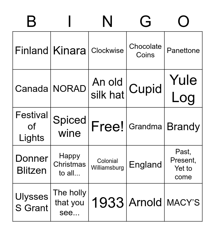 This bingo card has a free space and 42 words: White, An old silk hat, You’ll shoot your eye out, kid., Happy Christmas to all..., Arnold, Past, Present, Yet to come, MACY’S, GERMANY, Clockwise, Colonial Williamsburg, Brandy, Yule Log, Spiced wine, Panettone, Egg Nog, England, 1931, Festival of Lights, Stonehenge, Kinara, Canada, Boris Karloff, Pere Noel, Finland, Vixen, Thurl Ravenscroft, Cupid, Turkey, Saturnalia, Black Red Green, Thomas Nast, Donner Blitzen, NORAD, 1933, Benjamin Harrison, Ulysses S Grant, The holly that you see..., Grandma, Cheer, Deck the Halls, Chocolate Coins and Jelly Doughnut.