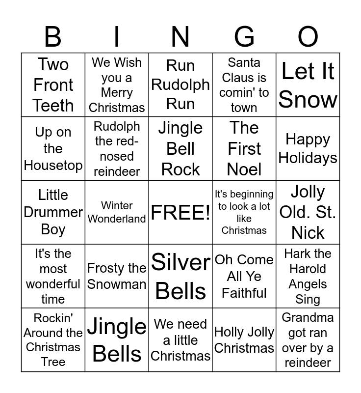 This bingo card has a free space and 24 words: Frosty the Snowman, Jingle Bells, Jingle Bell Rock, Rockin' Around the Christmas Tree, Let It Snow, Two Front Teeth, Up on the Housetop, We Wish you a Merry Christmas, It's beginning to look a lot like Christmas, Silver Bells, The First Noel, Little Drummer Boy, Oh Come All Ye Faithful, Hark the Harold Angels Sing, Rudolph the red-nosed reindeer, Holly Jolly Christmas, Jolly Old. St. Nick, Run Rudolph Run, Happy Holidays, Winter Wonderland, Grandma got ran over by a reindeer, It's the most wonderful time, Santa Claus is comin' to town and We need a little Christmas.