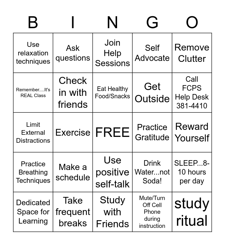 This bingo card has a free space and 24 words: Make a schedule, Take frequent breaks, Eat Healthy Food/Snacks, Dedicated Space for Learning, Remove Clutter, Use relaxation techniques, Remember....It's REAL Class, Ask questions, Practice Gratitude, Use positive self-talk, Get Outside, Limit External Distractions, Drink Water...not Soda!, SLEEP...8-10 hours per day, Check in with friends, Mute/Turn Off Cell Phone during instruction, Reward Yourself, Join Help Sessions, Call FCPS Help Desk 381-4410, Exercise, study ritual, Practice Breathing Techniques, Self Advocate and Study with Friends.
