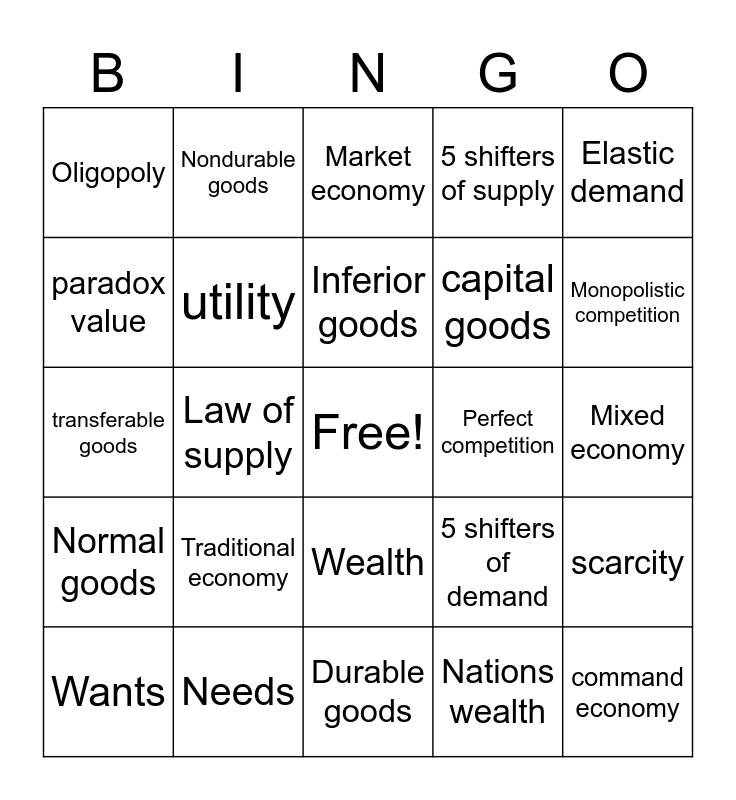 This bingo card has a free space and 36 words: Law of Demand, Substitution effect, Income effect, utility, 5 shifters of demand, Normal goods, Inferior goods, Demand, Elastic demand, inelastic demand, Law of supply, 5 shifters of supply, Functions of money, Perfect competition, Monopolistic competition, Oligopoly, Monopoly, Traditional economy, command economy, Market economy, Mixed economy, scarcity, Needs, Wants, Durable goods, Nondurable goods, transferable goods, consumer goods, capital goods, paradox value, Economics, Services, Nations wealth, Wealth, Financial system and Equity.