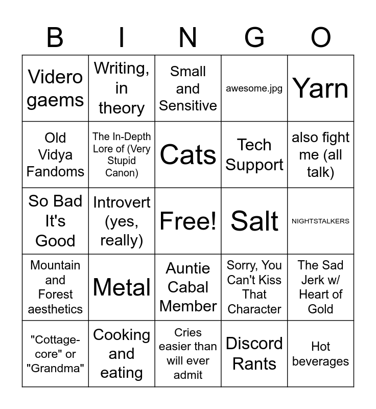 This bingo card has a free space and 24 words: Metal, Cooking and eating, Cats, "Cottage- core" or "Grandma", Yarn, Videro gaems, Old Vidya Fandoms, Writing, in theory, Salt, Auntie Cabal Member, Tech Support, So Bad It's Good, Sorry, You Can't Kiss That Character, The Sad Jerk w/ Heart of Gold, The In-Depth Lore of (Very Stupid Canon), Discord Rants, NIGHTSTALKERS, Small and Sensitive, also fight me (all talk), Introvert (yes, really), Hot beverages, Mountain and Forest aesthetics, awesome.jpg and Cries easier than will ever admit.