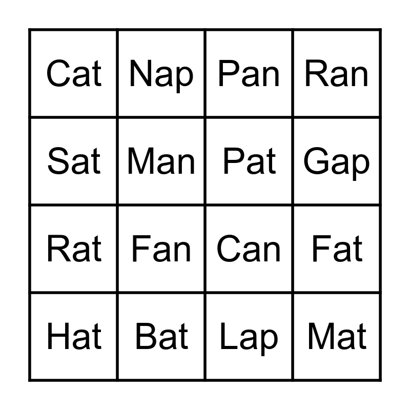 This bingo card has 22 words: Bat, Van, Nap, Cap, Man, Pat, Cat, Pan, Can, Mat, Rat, Ran, Map, Tan, Lap, Tap, Fat, Hat, Fan, Sat, Gap and Ban.