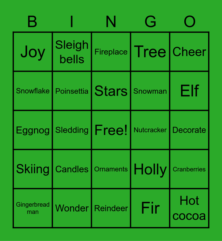 This bingo card has a free space and 40 words: Cookies, Eggnog, Icicles, Poinsettia, Wonder, Ornaments, Stars, Giving, Cheer, Skiing, Sledding, Tree, Hot cocoa, Decorate, Nutcracker, Candles, Wreath, Joy, Winter, Fireplace, Cranberries, Fir, Snowman, Snowflake, Mistletoe, Garland, Twinkle lights, Family, Carols, Mittens, Stocking, Gingerbread man, Candy cane, Holly, Elf, Reindeer, Holidays, Ice skates, Sleigh bells and Tinsel.