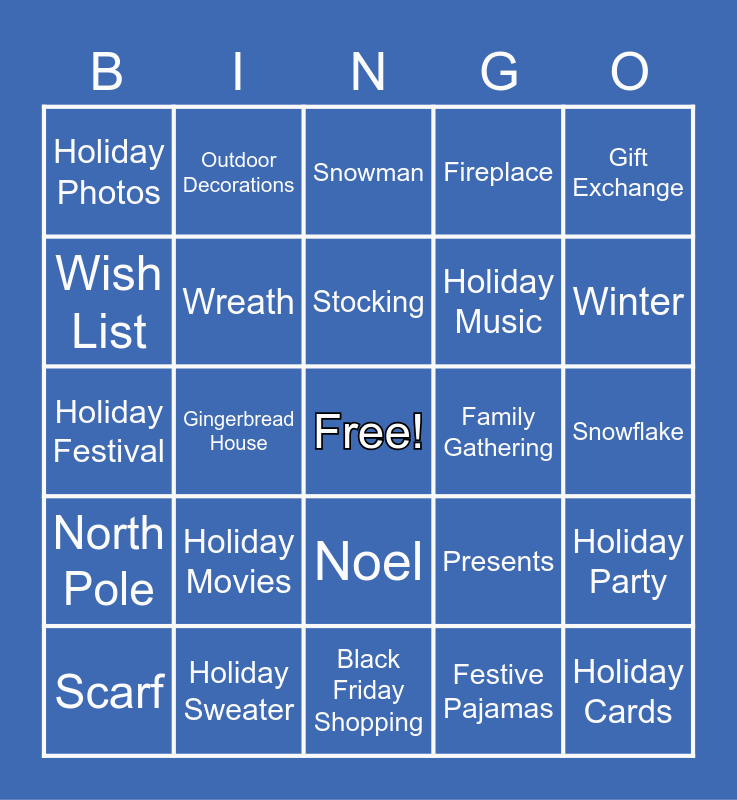 This bingo card has a free space and 49 words: Joy, Holiday Cards, Fruitcake, Black Friday Shopping, Holiday Movies, Holiday Baking, Outdoor Decorations, Holiday Lights, Wish List, Candy Canes, Wreath, Fireplace, Holiday Party, Presents, Hot Cocoa, Angel, Stocking, Family Gathering, Start, Gift Exchange, Gingerbread House, Festive Pajamas, Holiday Photos, Holiday Music, Eggnog, Winter, Scarf, Peppermint, Noel, North Pole, Mistletoe, Red, Bells, Cold, Holiday Sweater, Traveling, Ornament, Holiday Socks, Snowflake, Holiday Cheer, Poinsettia, Wrapping Paper, Ice Skating, Elf on the Shelf, Holiday Festival, Snowman, Nutcracker, Candle and Ribbons and Bows.
