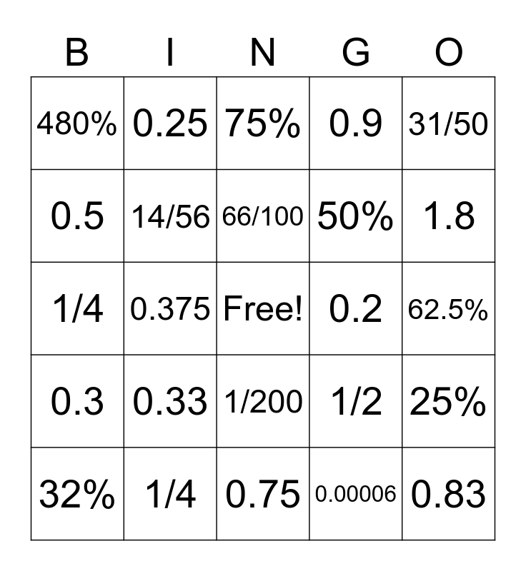 This bingo card has a free space and 27 words: 1/2, 3/4, 50%, 0.75, 0.5, 75%, 0.25, 0.3, 0.2, 25%, 1/4, 0.9, 32%, 1/4, 1.8, 0.56, 14/56, 66/100, 0.33, 480%, 62.5%, 0.00006, 0.375, 0.83, 1/200, 31/50 and 275%.