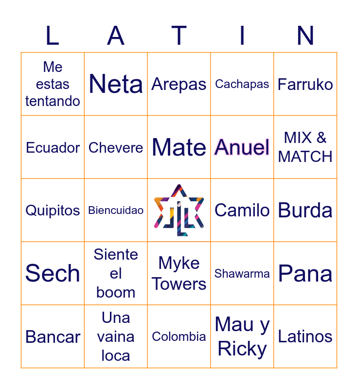 This bingo card has a free space and 300 words: Bad bunny, Ozuna, Sech, JBalvin, Anuel, Myke Towers, Farruko, Maluma, KarolG, Rombai, Tini, Morat, Camilo, Natti Natasha, Annita, Daddy Yankee, Mau y Ricky, Zion & Lennox, Tito el bambino, Rosalia, Na de na, Siente el boom, Lo que paso, paso, Salio el sol, Una vaina loca, Dakiti, Dale don dale, Me estas tentando, Panama, Venezuela, Colombia, Mexico, Ecuador, Chile, Argentina, Uruguay, Israel, Arepas, Pan de bono, Pan de queijo, Empanadas, Tamales, Enchiladas, Arroz con pollo, Pico de gallo, Asado, Sancocho, Ajiaco, Yabras, Shawarma, Falafel, Lajmayin, Latkes, Churros, Patacones, Marquesa, Pan de pavo, Cachapas, Ajiaco, Sancocho, ChocoCream, Pascual, Pirulin, Susy, Toronto, Alfajores, Milo, Ovomaltina, Quipitos, Maicena, Mate, Brigadeiro, Bamba, Bissli, Mekupelet, Pesek Zman, Lucas, Sufganiot, Miguelito, Mangomitas, Cotufas, Pana, Brother, Q xopa, Che, Q onda, Wey, Neta, Chill, Sababa, Webon, Awebao, Chucha, Foldea, Pifia, Chamo, Chevere, Mamera, Hacho, Bochinche, Que mas, Medallo, Caracas, Miami, New York, Latinos, Pana, Marquesa, Cachapa, Convives, Hawai, MIX & MATCH, FREE, Jewish Latin Link, Venezolanas, Burda, Chamo, Niche, Arepa, Pachuli, Arrecho, Cambur, Chamba, Carajito, Chevere, Hallaca, Ladilla, Malandro, Full, Panameño, Vaina, Chucha, Guilla, Pana, Brother, Ayala, Q’ xopa, Awebao, Birria, Pana, Pritti, Chuzo, Compa, Bulto, Biencuidao, Taquilla, Rantan, Chicheme, Arroz con pollo, Arroz con leche, Mexicano, Chavito, Wey, Qué onda, Gacho, Fresita, Neta, Ándale, No manches, Órale, Que padre, Chingón, Qué rollo, Chilaquilles, Tacos, Che, Quilombo, Cumbia, Boludo, Pibe, Bancar, Fiaca, Pelotudo, Posherudo, Boliche, Re, Mate, Ticas, Pura vida, Mae, Tico, Compa, Buena nota, Gallo Pinto, Güelé, Natilla, Juma, Carajillo, Corrongo, Pepiado, Bad bunny, Ozuna, Sech, JBalvin, Anuel, Myke Towers, Farruko, Maluma, KarolG, Rombai, Tini, Morat, Camilo, Natti Natasha, Annita, Daddy Yankee, Mau y Ricky, Zion & Lennox, Tito el bambino, Rosalia, Na de na, Siente el boom, Lo que paso, paso, Salio el sol, Una vaina loca, Dakiti, Dale don dale, Me estas tentando, Panama, Venezuela, Colombia, Mexico, Ecuador, Chile, Argentina, Uruguay, Israel, Arepas, Pan de bono, Pan de queijo, Empanadas, Tamales, Enchiladas, Arroz con pollo, Pico de gallo, Asado, Sancocho, Ajiaco, Yabras, Shawarma, Falafel, Lajmayin, Latkes, Churros, Patacones, Marquesa, Pan de pavo, Cachapas, Ajiaco, Sancocho, ChocoCream, Pascual, Pirulin, Susy, Toronto, Alfajores, Milo, Ovomaltina, Quipitos, Maicena, Mate, Brigadeiro, Bamba, Bissli, Mekupelet, Pesek Zman, Lucas, Sufganiot, Miguelito, Mangomitas, Cotufas, Pana, Brother, Q xopa, Che, Q onda, Wey, Neta, Chill, Sababa, Webon, Awebao, Chucha, Foldea, Pifia, Chamo, Chevere, Mamera, Hacho, Bochinche, Que mas, Medallo, Caracas, Miami, New York, Latinos, Pana, Marquesa, Cachapa and Convives.