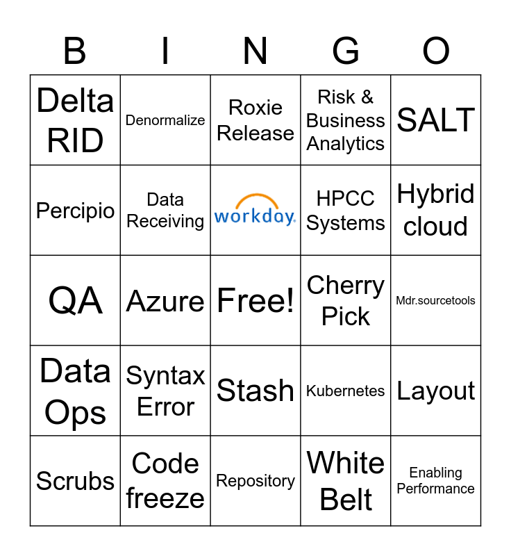 This bingo card has 5 images, a free space and 96 words: Address Cleaner, Attribute, Auto keys, Base File, Boolean, Branch, Build Process, CCPA, Cherry Pick, Cloud, Cluster, Code freeze, Code Review, Compliance training, Confluence, csv file, Data and Scoring Engineering, Data Development, Data Insight, Data lake, Data Ops, Data Receiving, Dataland, dataset, Dedup, Delta RID, Denormalize, Distribute, ECL Watch, Enabling Performance, Full + Delta, Function, Hash, HPCC Systems, Hybrid cloud, Objectives, Jira, Keys, Kubernetes, Layout, LinkIds, Linking, LN Cares, Logical File, Mdr.sourcetools, Merge Request, Azure, Name Cleaner, Normalize, ORBIT, Outlook, PaaS, Parameters, Password, Payload, Percipio, Persist, PRTE Key, PTO, Public Records, QA, Query, Repository, Risk & Business Analytics, Risk Solutions, Rollback, Rollup, Roxie Release, SaaS, SALT, Scrubs, Security is a journey, Serverless computing, Software engineer, Sort, Source RID, Spray, Stash, Status Report, Strata, Superfile, Syntax Error, Tapeload, Thor patch, ThorProd, Tortoise GIT, Transform, Vendor, Version, Virtual machine, Visual Studio, VPN, Webinar, White Belt, Workunit and Yellow Belt.