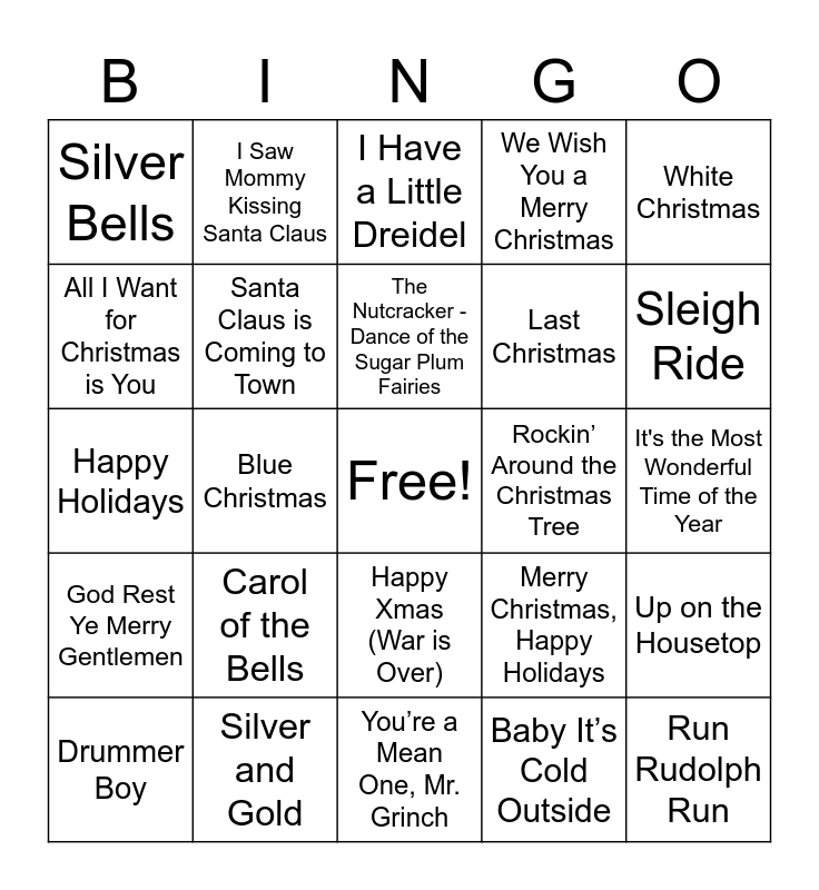 This bingo card has a free space and 63 words: The Christmas Shoes, Frosty the Snowman, Rudolph the Red-Nosed Reindeer, Up on the Housetop, Veni, Veni, Emmanuel, Santa Baby, I Saw Mommy Kissing Santa Claus, We Three Kings, The Nutcracker - Dance of the Sugar Plum Fairies, Lieutenant Kije Suite - Troika, Happy Xmas (War is Over), Winter Wonderland, It's the Most Wonderful Time of the Year, White Christmas, Jingle Bells, All I Want for Christmas is You, Blue Christmas, Silver Bells, Feliz Navidad, Last Christmas, Carol of the Bells, God Rest Ye Merry Gentlemen, We Wish You a Merry Christmas, The Holly and the Ivy, In the Bleak Midwinter, I Saw Three Ships, Once in Royal David’s City, Jingle Bell Rock, O Magnum Mysterium, Bogoroditse Devo, Lo, How a Rose E’er Blooming, Greensleeves, Good King Wenceslas, Parade of the Wooden Soldiers, Sleigh Ride, Drummer Boy, Silent Night, Baby It’s Cold Outside, Deck the Halls, Santa Claus is Coming to Town, Happy Holidays, Rockin’ Around the Christmas Tree, Mele Kalikimaka, I Heard the Bells on Christmas Day, Run Rudolph Run, Silver and Gold, Grandma Got Run Over by a Reindeer, Merry Christmas, Happy Holidays, Where are you, Christmas?, The Twelve Days of Christmas, I Want a Hippopotamus for Christmas, You’re a Mean One, Mr. Grinch, The Chipmunk Song, The Christmas Song (Chestnuts Roasting on an Open Fire), I’ve Got My Love to Keep Me Warm, I Have a Little Dreidel, Hanukkah Dance, Pretty Paper, Hard Candy Christmas, Christmas Time is Here, Santa Tell Me, Mistletoe and Have Yourself a Merry Little Christmas.