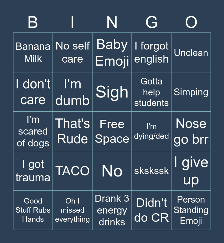 This bingo card has a free space and 24 words: Good Stuff Rubs Hands, TACO, Sigh, Didn't do CR, Unclean, Banana Milk, No self care, Baby Emoji, I'm dying/ded, Nose go brr, I'm scared of dogs, I'm dumb, skskssk, I give up, I don't care, Oh I missed everything, Drank 3 energy drinks, I forgot english, Simping, I got trauma, That's Rude, No, Gotta help students and Person Standing Emoji.
