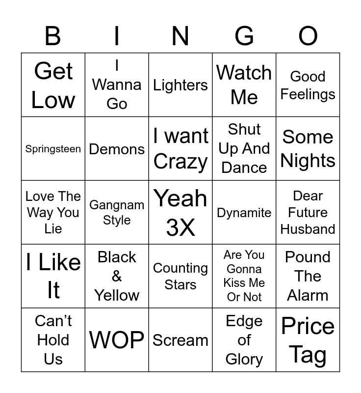 This bingo card has a free space and 24 words: Black & Yellow, WOP, I want Crazy, Can’t Hold Us, Good Feelings, Get Low, Springsteen, I Wanna Go, Dynamite, Counting Stars, Shut Up And Dance, Love The Way You Lie, Are You Gonna Kiss Me Or Not, Pound The Alarm, Demons, Edge of Glory, Dear Future Husband, Lighters, Some Nights, Gangnam Style, Price Tag, I Like It, Watch Me and Scream.