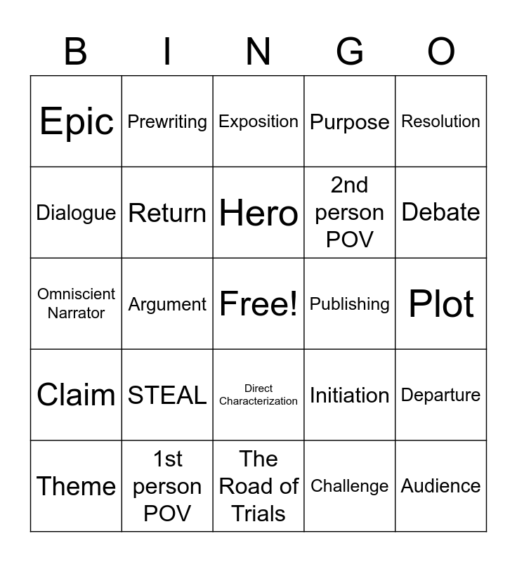 This bingo card has a free space and 24 words: STEAL, 1st person POV, Hero, Theme, Resolution, Epic, Dialogue, Prewriting, Publishing, Direct Characterization, 2nd person POV, Omniscient Narrator, Initiation, Departure, Return, Challenge, Plot, Exposition, Debate, Argument, Audience, Claim, Purpose and The Road of Trials.