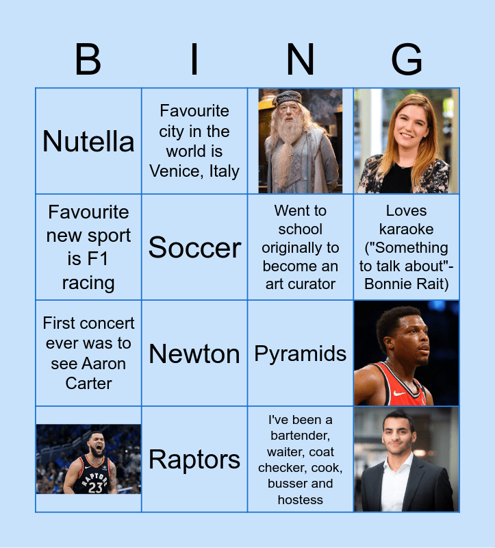 This bingo card has 6 images and 18 words: Had 7 dogs at one point, Was a camp counselor as a teenager, Loves karaoke ("Something to talk about"- Bonnie Rait), Arsenal FC, Favourite new sport is F1 racing, Nutella, Soccer, Favourite city in the world is Venice, Italy, Raptors, Over 30 plants in their apartment, First concert ever was to see Aaron Carter, Pyramids, Had a British accent as a kid, Egypt, Went to school originally to become an art curator, Nandos, I've been a bartender, waiter, coat checker, cook, busser and hostess and Newton.