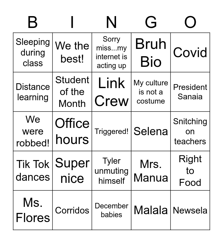 This bingo card has 40 words: Growth mindset, We were robbed!, Costume winner, Student of the Month, Corridos, Tyler unmuting himself, Link Crew, Green team, Covid, Tik Tok dances, Office hours, Bruh Bio, Triggered!, Snitching on teachers, Selena, Super nice, Cameras off, Sleeping during class, Sorry brb, Sorry miss...my internet is acting up, Right to Food, Malala, My culture is not a costume, Distance learning, Baby Yoda, Nearpod, Grey's Anatomy, LGBTQ+, Newsela, Ms. Botello, Ms. A, Ms. Flores, Ms. Tevaga, Mrs. Manua, President Sanaia, December babies, Academic prep, 30 students, We the best! and Wear a mask!.
