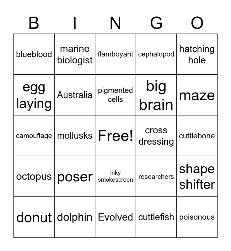 This bingo card has a free space and 29 words: donut, squid, mollusks, calamari, blueblood, flamboyant, Australia, poser, cross dressing, dolphin, cuttlebone, poisonous, Evolved, cuttlefish, maze, troy, inky smokescreen, octopus, hatching hole, camouflage, researchers, morphing, big brain, egg laying, cephalopod, marine biologist, shape shifter, pigmented cells and electric skin.