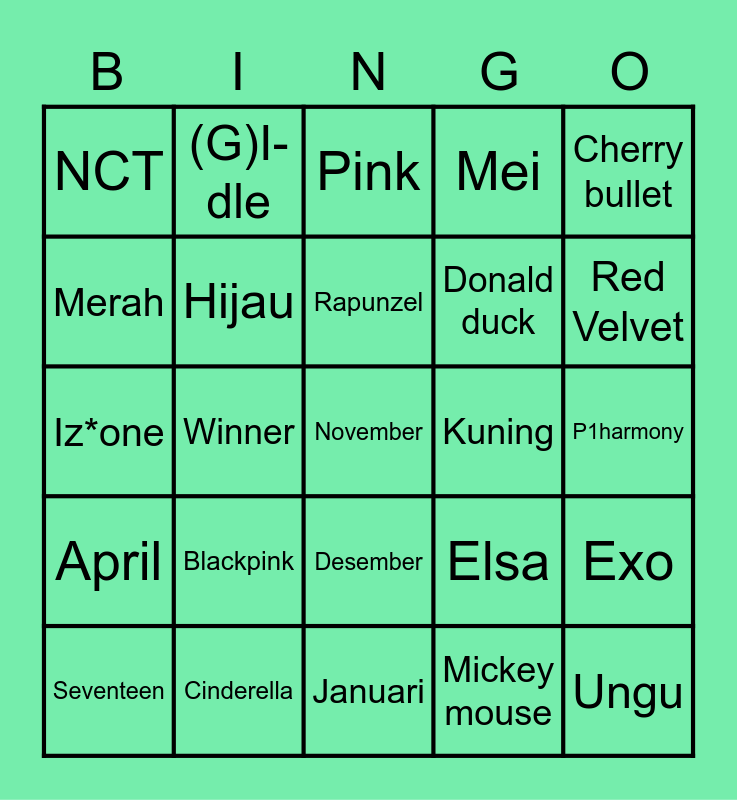 This bingo card has 25 words: Blackpink, Januari, Rapunzel, Seventeen, Cherry bullet, NCT, Merah, (G)I-dle, Kuning, Desember, Donald duck, Iz*one, Elsa, Exo, Hijau, Ungu, P1harmony, Pink, Red Velvet, Winner, November, Cinderella, April, Mei and Mickey mouse.