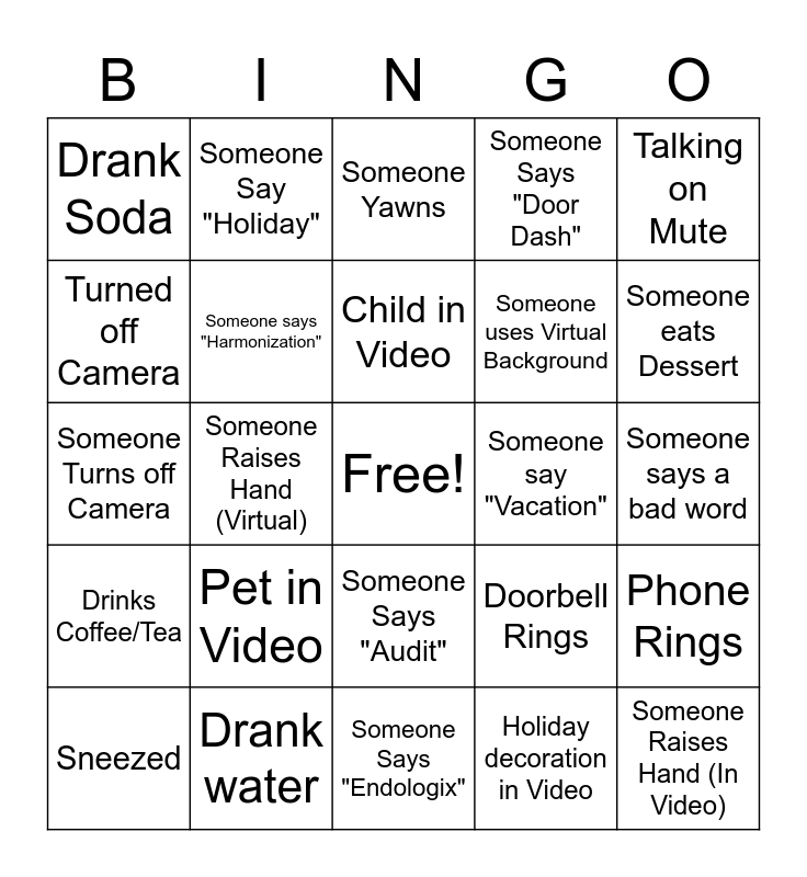This bingo card has a free space and 24 words: Pet in Video, Drank water, Child in Video, Sneezed, Talking on Mute, Drank Soda, Turned off Camera, Someone Say "Holiday", Someone say "Vacation", Someone Says "Audit", Someone uses Virtual Background, Someone Turns off Camera, Doorbell Rings, Phone Rings, Someone says "Harmonization", Holiday decoration in Video, Someone says a bad word, Someone Yawns, Someone eats Dessert, Someone Raises Hand (Virtual), Someone Raises Hand (In Video), Drinks Coffee/Tea, Someone Says "Door Dash" and Someone Says "Endologix".