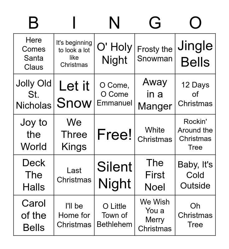 This bingo card has a free space and 24 words: Last Christmas, I'll be Home for Christmas, O Come, O Come Emmanuel, Carol of the Bells, Jingle Bells, Here Comes Santa Claus, Jolly Old St. Nicholas, It's beginning to look a lot like Christmas, White Christmas, Silent Night, Away in a Manger, Joy to the World, The First Noel, Baby, It's Cold Outside, Let it Snow, We Wish You a Merry Christmas, Rockin' Around the Christmas Tree, O' Holy Night, 12 Days of Christmas, We Three Kings, Oh Christmas Tree, Deck The Halls, Frosty the Snowman and O Little Town of Bethlehem.
