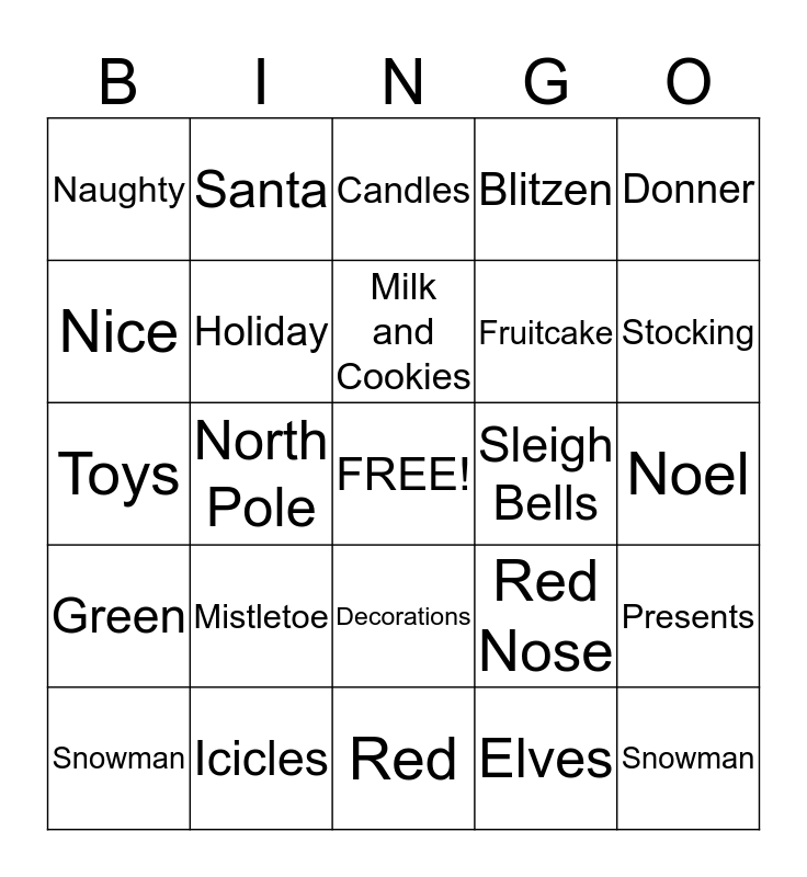 This bingo card has a free space and 24 words: Mistletoe, Icicles, Milk and Cookies, Snowman, Donner, Naughty, Nice, Santa, Sleigh Bells, Decorations, Fruitcake, Toys, Red Nose, Presents, Holiday, Elves, Noel, Candles, Stocking, North Pole, Snowman, Green, Blitzen and Red.
