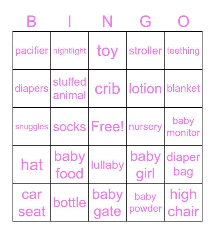 This bingo card has a free space and 24 words: baby food, bottle, crib, car seat, teething, pacifier, diapers, nightlight, nursery, lullaby, lotion, snuggles, baby girl, diaper bag, stuffed animal, baby powder, baby monitor, toy, blanket, socks, high chair, hat, stroller and baby gate.