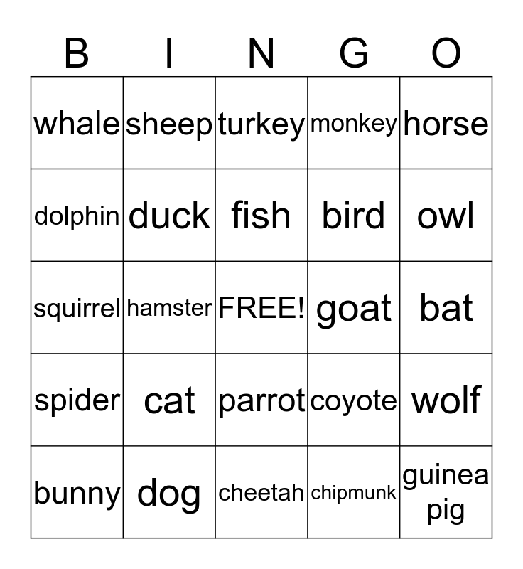 This bingo card has a free space and 24 words: cat, dog, fish, bunny, horse, whale, dolphin, sheep, goat, parrot, bird, squirrel, coyote, wolf, duck, chipmunk, bat, turkey, owl, hamster, guinea pig, spider, monkey and cheetah.