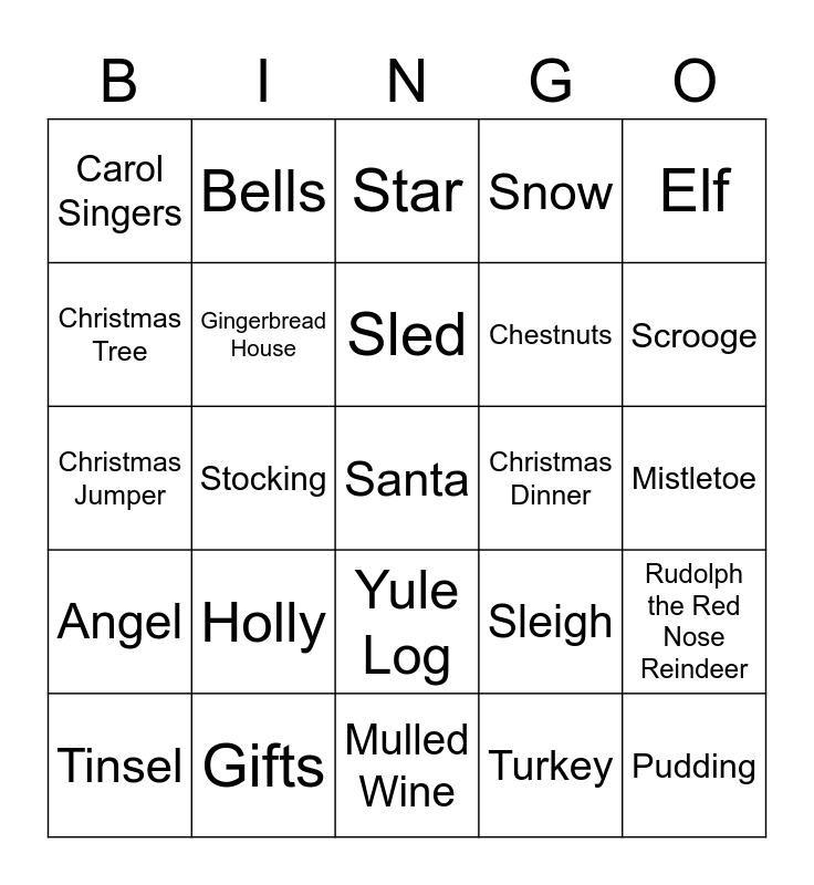 This bingo card has a free space and 24 words: Holly, Gifts, Sled, Tinsel, Elf, Carol Singers, Christmas Tree, Bells, Christmas Dinner, Yule Log, Chestnuts, Christmas Jumper, Sleigh, Rudolph the Red Nose Reindeer, Gingerbread House, Turkey, Mistletoe, Star, Scrooge, Stocking, Pudding, Angel, Snow and Mulled Wine.