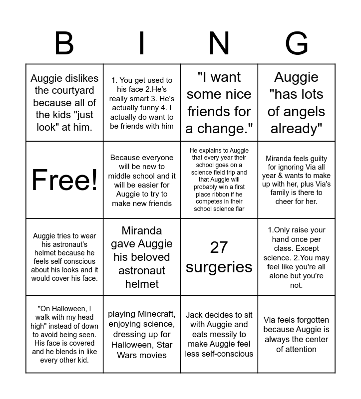 This bingo card has 16 words: playing Minecraft, enjoying science, dressing up for Halloween, Star Wars movies, 1.Only raise your hand once per class. Except science. 2.You may feel like you're all alone but you're not., "I want some nice friends for a change.", Auggie dislikes the courtyard because all of the kids "just look" at him., Auggie tries to wear his astronaut's helmet because he feels self conscious about his looks and it would cover his face., 1. You get used to his face 2.He's really smart 3. He's actually funny 4. I actually do want to be friends with him, 27 surgeries, Jack decides to sit with Auggie and eats messily to make Auggie feel less self-conscious, Free!, Because everyone will be new to middle school and it will be easier for Auggie to try to make new friends, "On Halloween, I walk with my head high" instead of down to avoid being seen. His face is covered and he blends in like every other kid., Auggie "has lots of angels already", Miranda gave Auggie his beloved astronaut helmet, Miranda feels guilty for ignoring Via all year & wants to make up with her, plus Via's family is there to cheer for her., He explains to Auggie that every year their school goes on a science field trip and that Auggie will probably win a first place ribbon if he competes in their school science fiar and Via feels forgotten because Auggie is always the center of attention.