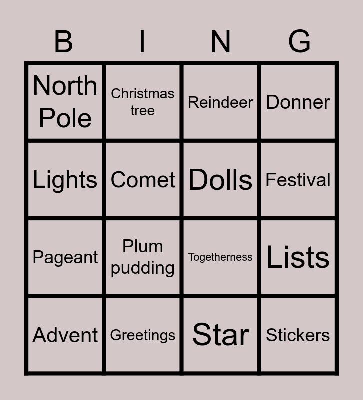 This bingo card has 51 words: Free!, Advent, Angels, Blitzen, Candles, Christmas cookies, Christmas tree, Cold, Comet, Dancer, Dolls, Donner, Dressing, Eggnog, Elves, Family reunion, Festival, Greetings, Ham, Lights, Lists, Merry, North Pole, Pageant, Pie, Pine, Plum pudding, Prancer, Red/green, Reindeer, Ribbon, Rudolph, Sacred, Sales, Sauce, Scrooge, Snowflakes, Spirit, St. Nick, Stand, Star, Stickers, Stocking stuffers, Sweet potato, Tidings, Tinsel, Togetherness, Toys, Tradition, Wrapping paper and Wreath.