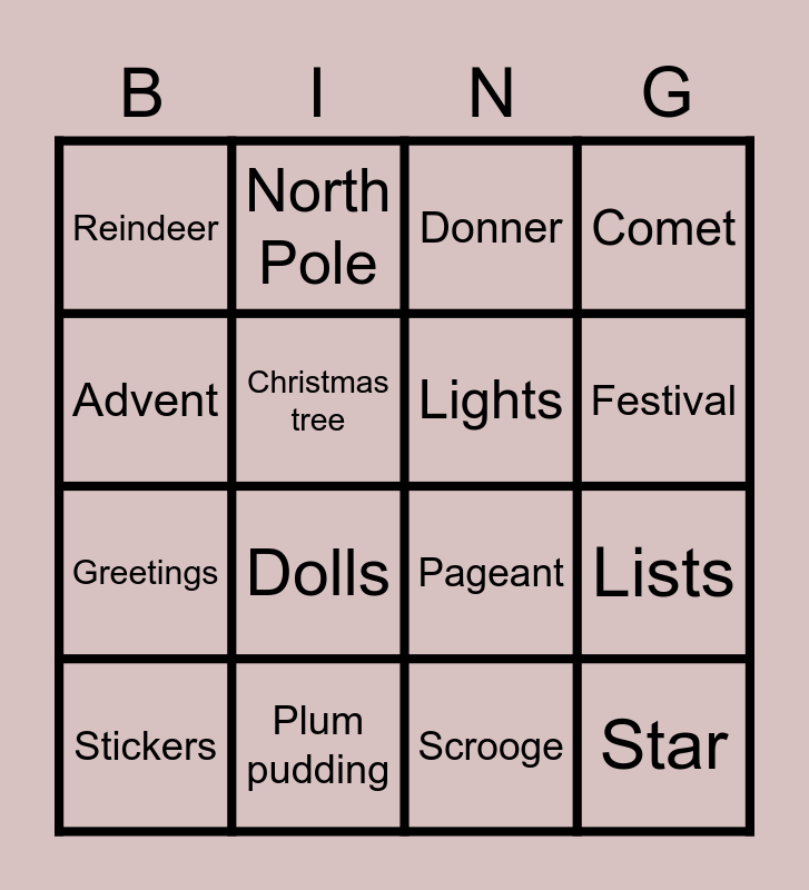 This bingo card has 51 words: Free!, Advent, Angels, Blitzen, Candles, Christmas cookies, Christmas tree, Cold, Comet, Dancer, Dolls, Donner, Dressing, Eggnog, Elves, Family reunion, Festival, Greetings, Ham, Lights, Lists, Merry, North Pole, Pageant, Pie, Pine, Plum pudding, Prancer, Red/green, Reindeer, Ribbon, Rudolph, Sacred, Sales, Sauce, Scrooge, Snowflakes, Spirit, St. Nick, Stand, Star, Stickers, Stocking stuffers, Sweet potato, Tidings, Tinsel, Togetherness, Toys, Tradition, Wrapping paper and Wreath.