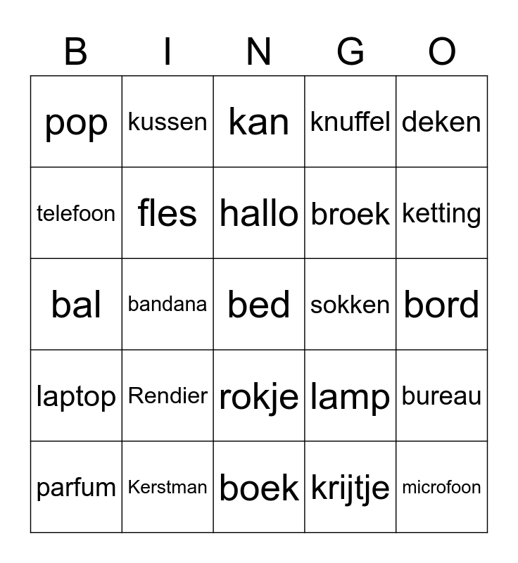 This bingo card has a free space and 24 words: Rendier, Kerstman, hallo, parfum, deken, pop, telefoon, kussen, sokken, rokje, broek, bal, lamp, bureau, fles, krijtje, bord, kan, ketting, bandana, microfoon, laptop, knuffel and boek.