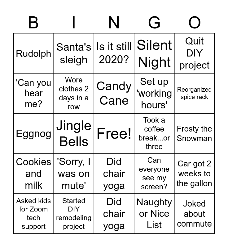 This bingo card has a free space and 24 words: 'Sorry, I was on mute', Started DIY remodeling project, Candy Cane, Asked kids for Zoom tech support, Quit DIY project, Rudolph, 'Can you hear me?, Santa's sleigh, Took a coffee break...or three, Did chair yoga, Set up 'working hours', Eggnog, Can everyone see my screen?, Car got 2 weeks to the gallon, Wore clothes 2 days in a row, Naughty or Nice List, Frosty the Snowman, Is it still 2020?, Reorganized spice rack, Jingle Bells, Joked about commute, Cookies and milk, Silent Night and Did chair yoga.