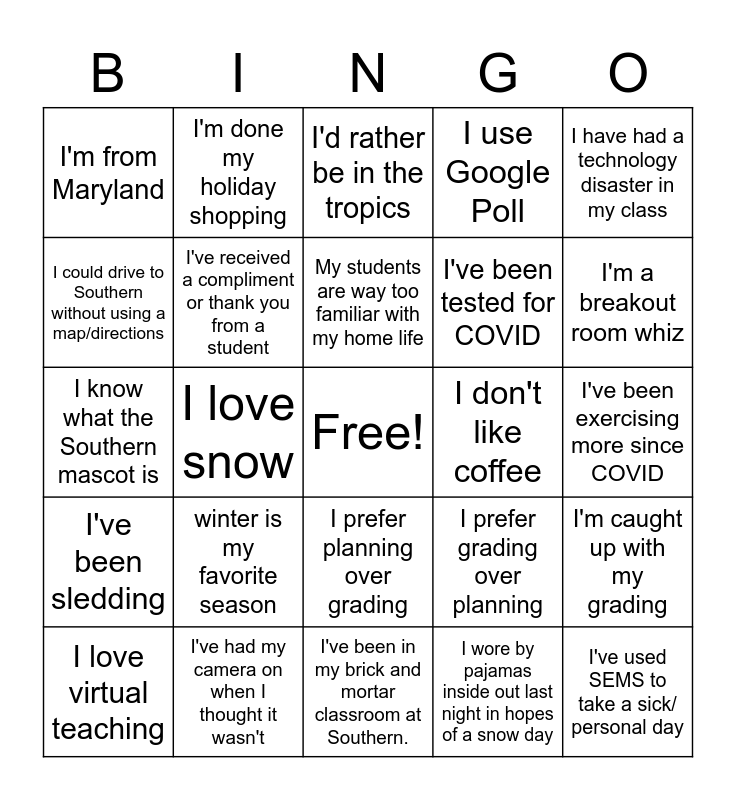 This bingo card has a free space and 24 words: winter is my favorite season, I've had my camera on when I thought it wasn't, My students are way too familiar with my home life, I love virtual teaching, I have had a technology disaster in my class, I'm from Maryland, I could drive to Southern without using a map/directions, I'm done my holiday shopping, I don't like coffee, I prefer planning over grading, I've been tested for COVID, I know what the Southern mascot is, I prefer grading over planning, I'm caught up with my grading, I've received a compliment or thank you from a student, I wore by pajamas inside out last night in hopes of a snow day, I've been exercising more since COVID, I'd rather be in the tropics, I'm a breakout room whiz, I love snow, I've used SEMS to take a sick/ personal day, I've been sledding, I use Google Poll and I've been in my brick and mortar classroom at Southern..