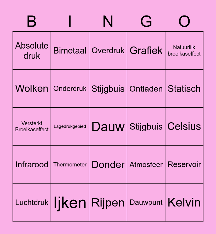 This bingo card has a free space and 29 words: Luchtdruk, Barometer, Lagedrukgebied, Hogedrukgebied, Absolute druk, Overdruk, Onderdruk, Thermometer, Stijgbuis, Ijken, Celsius, Kelvin, Rijpen, Dauwpunt, Statisch, Bliksem, Donder, Infrarood, Natuurlijk broeikaseffect, Versterkt Broeikaseffect, Atmosfeer, Wrijving, Ontladen, Wolken, Grafiek, Bimetaal, Reservoir, Stijgbuis and Bar.