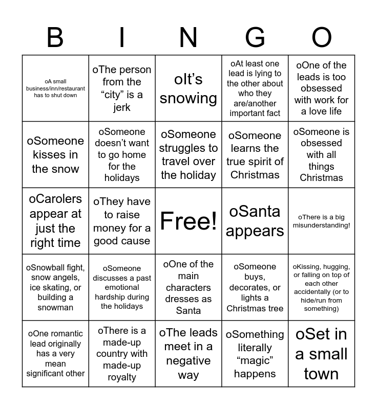 This bingo card has a free space and 44 words: oLove interests meet by literally bumping into each other, oSet in a small town, oEvery scene is meticulously decorated for Christmas, oOne romantic lead originally has a very mean significant other, oSomeone has lost the spirit of Christmas, oSomething literally “magic” happens, oIt’s snowing, oSomeone kisses under mistletoe, oOne of the leads is too obsessed with work for a love life, oThere is a made-up country with made-up royalty, oAt least one lead is lying to the other about who they are/another important fact, oSanta appears, oOne of the main characters dresses as Santa, oSomeone discusses a past emotional hardship during the holidays, oThe leads hate each other at the beginning, oThe leads meet in a negative way, oA Santa/elf/magical guide helps the lead(s) make the right decision, oCarolers appear at just the right time, oSomeone breaks off an engagement, oSomeone is obsessed with all things Christmas, oThe person from the “city” is a jerk, oThe person from the small town is the perfect man/woman, oOne lead is making a business decision that will somehow hurt the other one, oA small business/inn/restaurant has to shut down, oSomeone has a hidden identity, oThere is a big misunderstanding!, oThey say “I love you” within a week of meeting each other, oA montage! (lots of scenes cut together to show time passing), oSomeone buys, decorates, or lights a Christmas tree, oSnowball fight, snow angels, ice skating, or building a snowman, oSomeone has an overbearing parent, oKissing, hugging, or falling on top of each other accidentally (or to hide/run from something), oHiring a date or faking a relationship, oSomething has to happen “by Christmas”…or else!, oThey have to raise money for a good cause, oTitle has the word “Christmas” in it, oSomeone cries happy tears, oThe town or character has a “Christmas” name (Chris, Nick, Holly, “Holiday, MA”), oSomeone struggles to travel over the holiday, oSomeone kisses in the snow, oSomeone learns the true spirit of Christmas, oGiving gifts to kids in need, oSomeone doesn’t want to go home for the holidays and oA proposal or a wedding (of the people who just met).