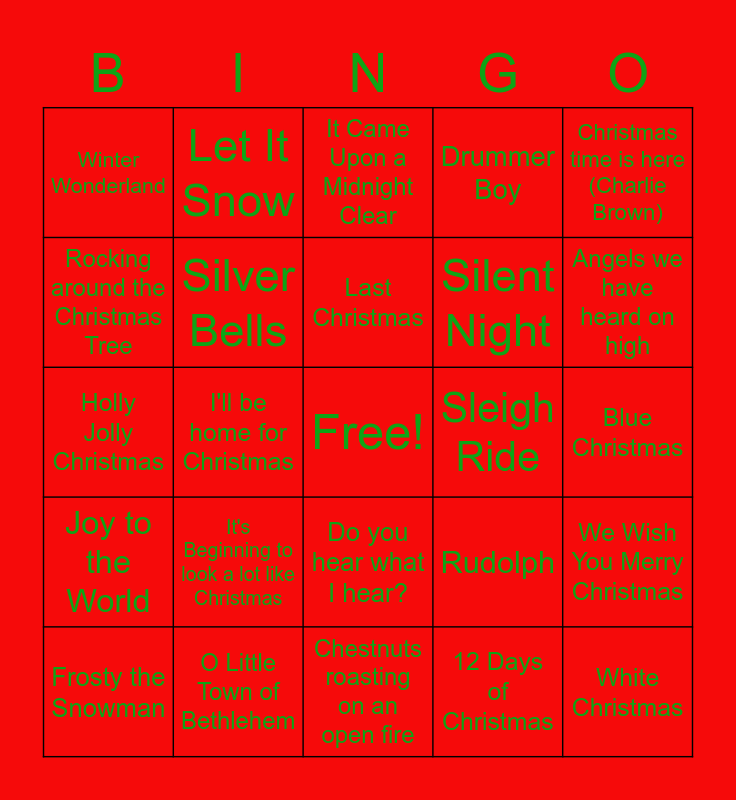This bingo card has a free space and 39 words: Deck the Halls, Away in Manger, Christmas Shoes, Silver Bells, Frosty the Snowman, Do you hear what I hear?, Last Christmas, It's the most wonderful time of the year, Christmas time is here (Charlie Brown), Joy to the World, I'll be home for Christmas, Drummer Boy, White Christmas, Blue Christmas, Sleigh Ride, It's Beginning to look a lot like Christmas, Feliz Navidad, Winter Wonderland, O Holy Night, Rudolph, Rocking around the Christmas Tree, Chestnuts roasting on an open fire, Silent Night, Angels we have heard on high, Mary, did you know?, Jingle Bell Rock, Happy Holidays, Have Yourself a Merry Little Christmas, O Come All Ye Faithful, Let It Snow, I heard the Bells On Christmas Morning, Carol of the Bells, It Came Upon a Midnight Clear, O Little Town of Bethlehem, 12 Days of Christmas, Up on the House Top, We Wish You Merry Christmas, Holly Jolly Christmas and I want a Hippopotamus for Christmas.