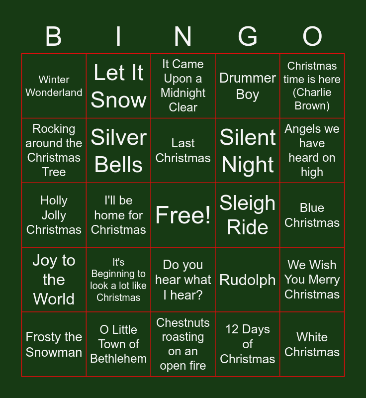 This bingo card has a free space and 39 words: Deck the Halls, Away in Manger, Christmas Shoes, Silver Bells, Frosty the Snowman, Do you hear what I hear?, Last Christmas, It's the most wonderful time of the year, Christmas time is here (Charlie Brown), Joy to the World, I'll be home for Christmas, Drummer Boy, White Christmas, Blue Christmas, Sleigh Ride, It's Beginning to look a lot like Christmas, Feliz Navidad, Winter Wonderland, O Holy Night, Rudolph, Rocking around the Christmas Tree, Chestnuts roasting on an open fire, Silent Night, Angels we have heard on high, Mary, did you know?, Jingle Bell Rock, Happy Holidays, Have Yourself a Merry Little Christmas, O Come All Ye Faithful, Let It Snow, I heard the Bells On Christmas Morning, Carol of the Bells, It Came Upon a Midnight Clear, O Little Town of Bethlehem, 12 Days of Christmas, Up on the House Top, We Wish You Merry Christmas, Holly Jolly Christmas and I want a Hippopotamus for Christmas.
